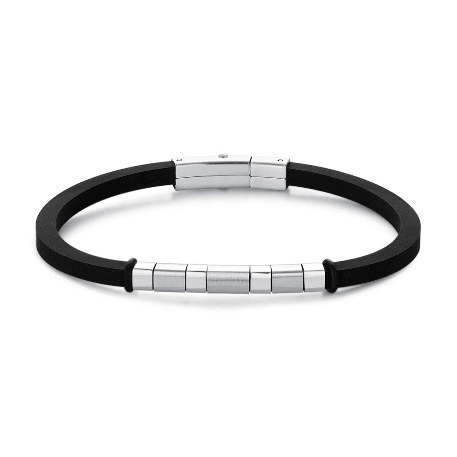 Stainless steel bracelet with black band and metal elements.