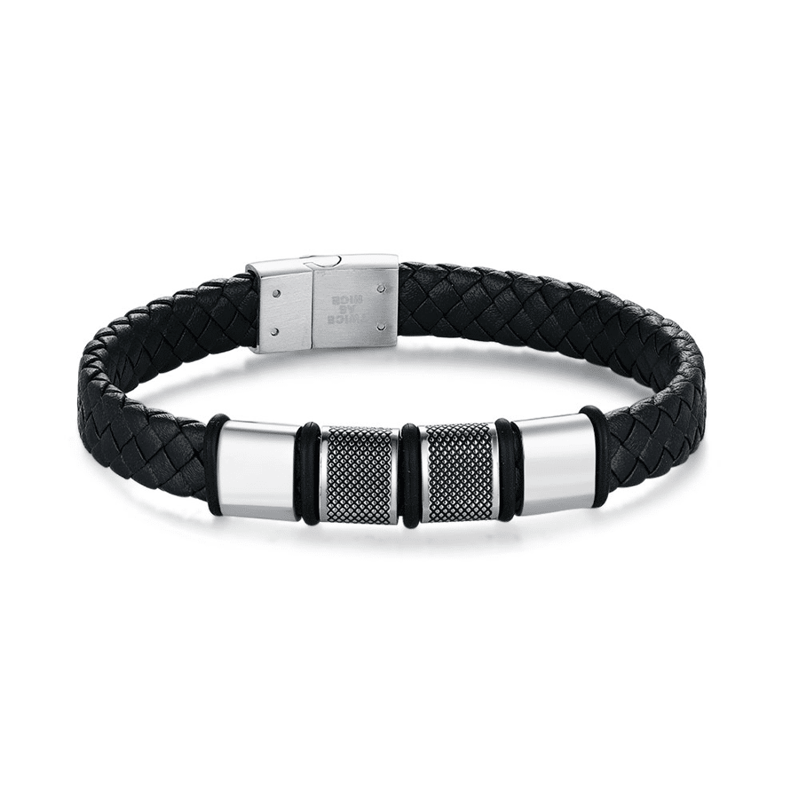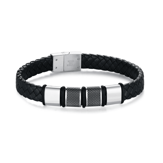 Stainless steel bracelet, braided design with metal accents.