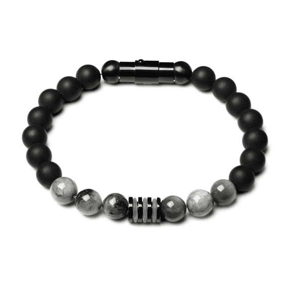 Stainless steel bracelet, matte black and grey stones, with a structured detail.