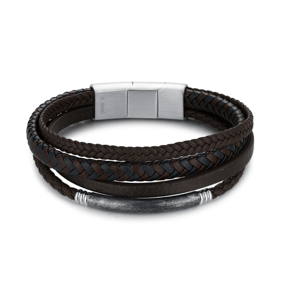 Stainless steel bracelet, with braided leather bands in brown and black.