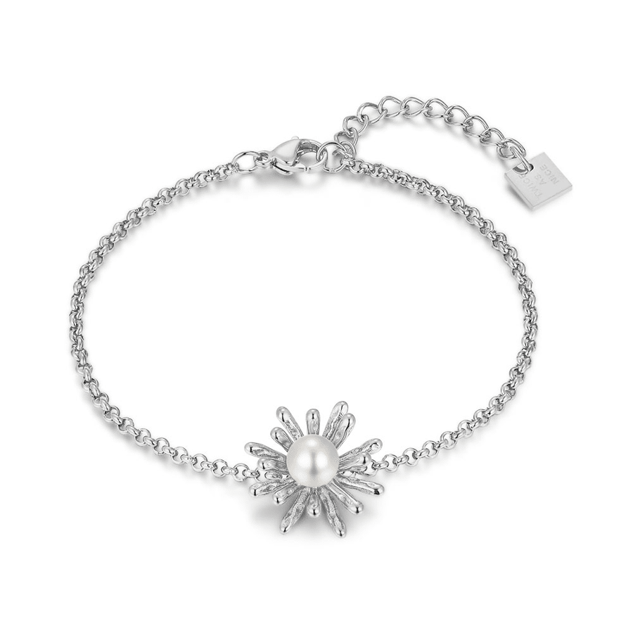 Stainless steel bracelet, flower structure with a pearl in the center.