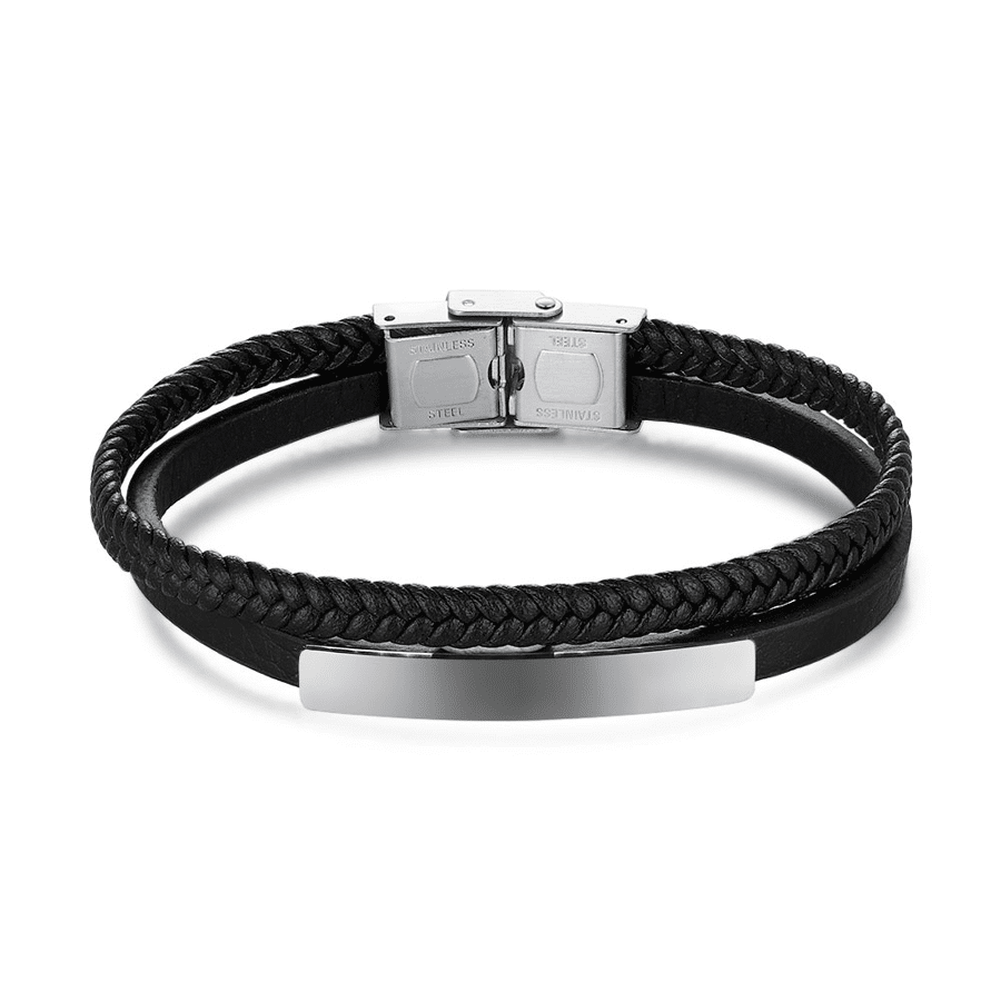 Stainless steel bracelet with a braided leather band.