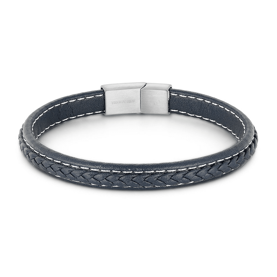 Stainless steel bracelet with a braided leather band and a sturdy clasp.