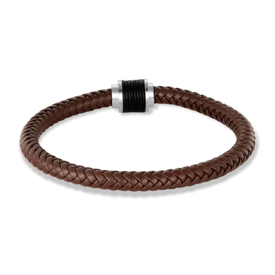 Stainless steel bracelet with a braided leather band and a metal clasp.