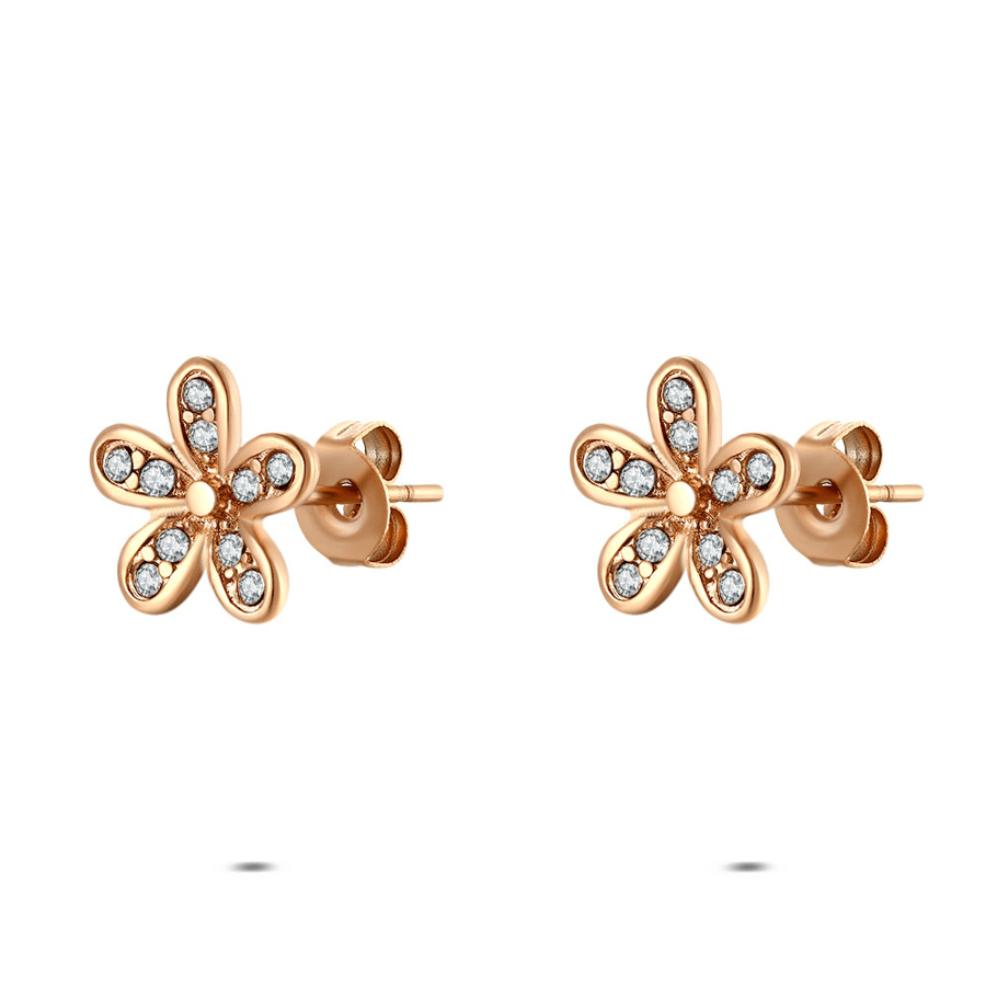 Earrings in unknown material, flower shape with zirconia. Elegant and playful design.