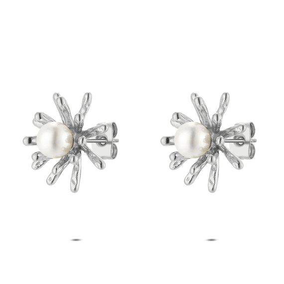 Earrings in stainless steel, flower with pearl