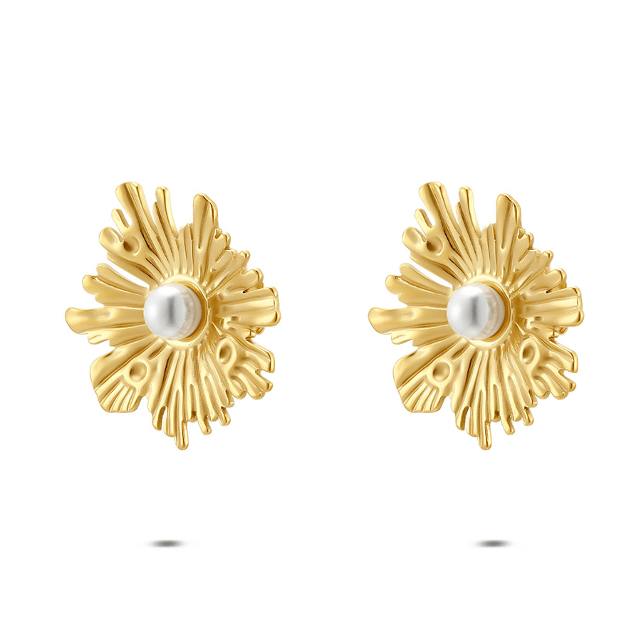 Stainless steel earrings, featuring a pearl in the center and a wavy design around.