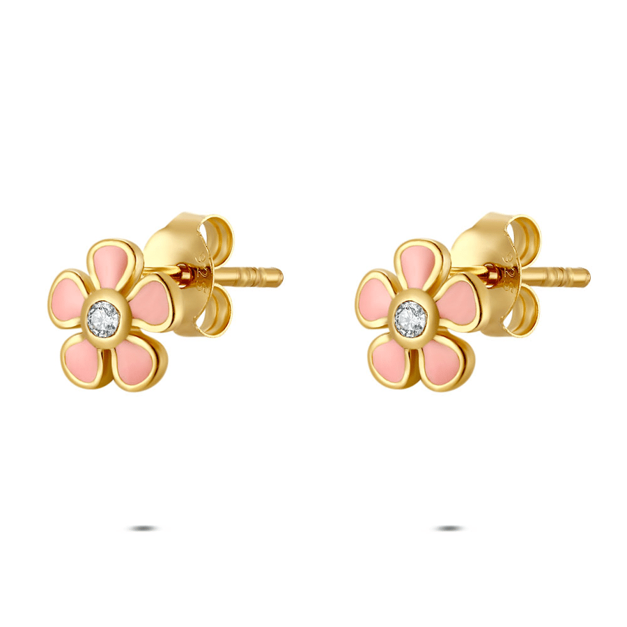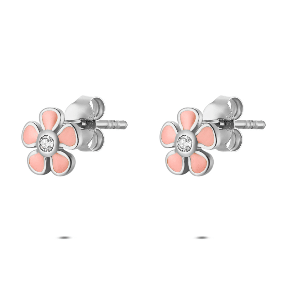 Silver earrings, flower shape with pink accents and a zirconia in the center.