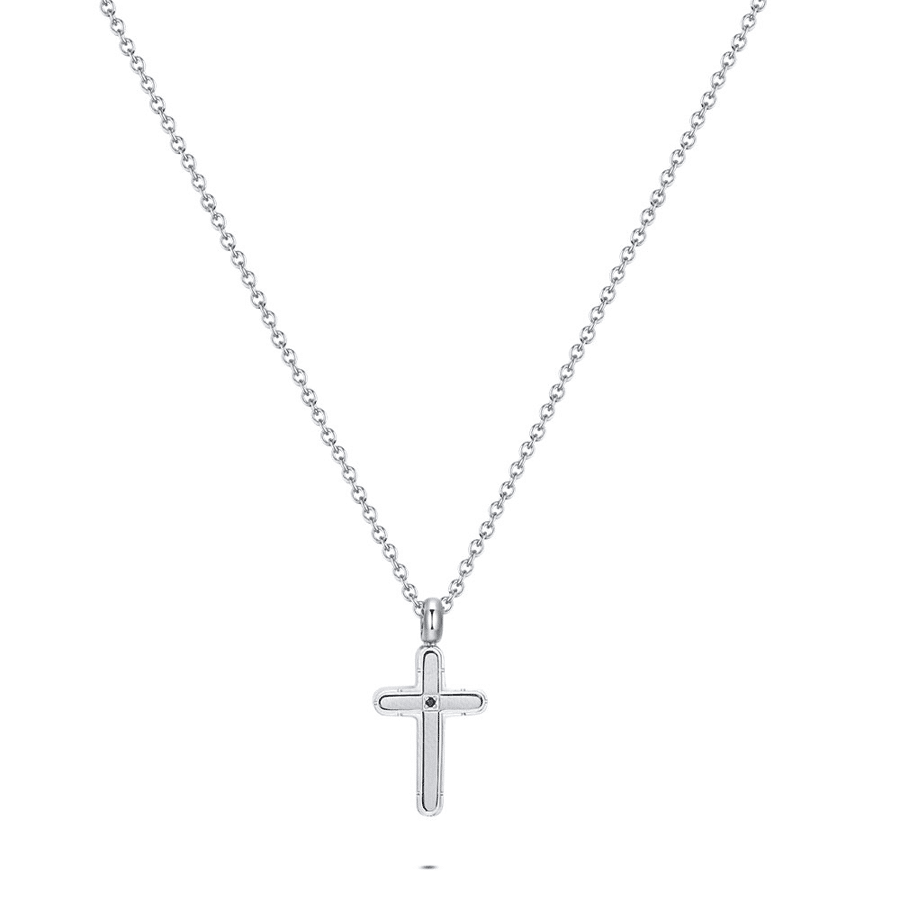 Necklace in stainless steel, cross with a black zirconia.