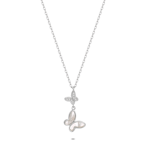 Silver coloured silver necklace, two butterflies with a mother of pearl and shiny finish.