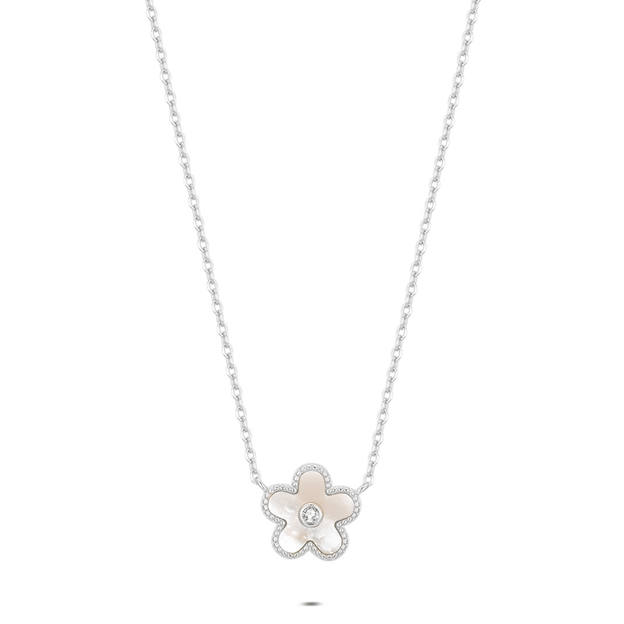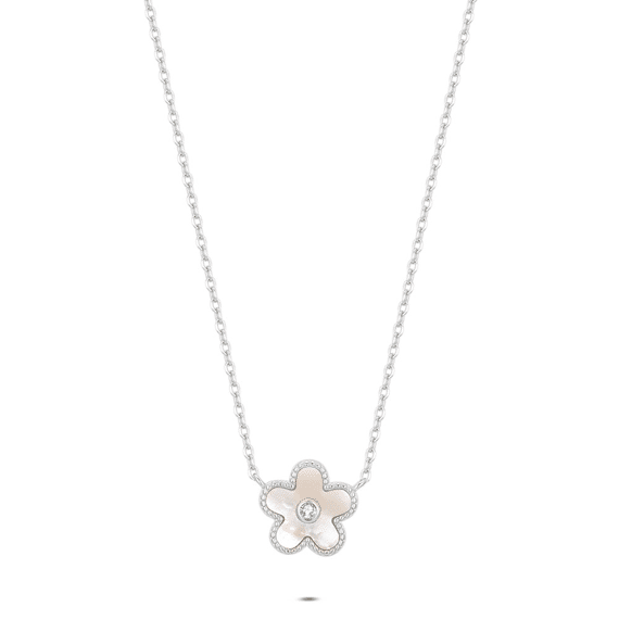 Silver coloured silver necklace, flower shape with a pearl in the center.