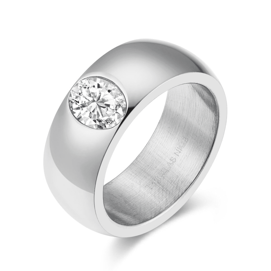 Stainless steel ring, round zirconia on a smooth band.