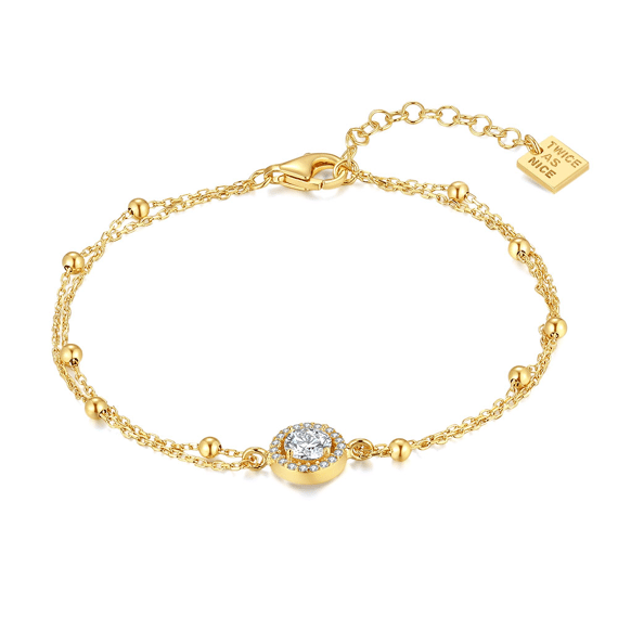 Silver bracelet, gold-tone double chain with round zirconia stone
