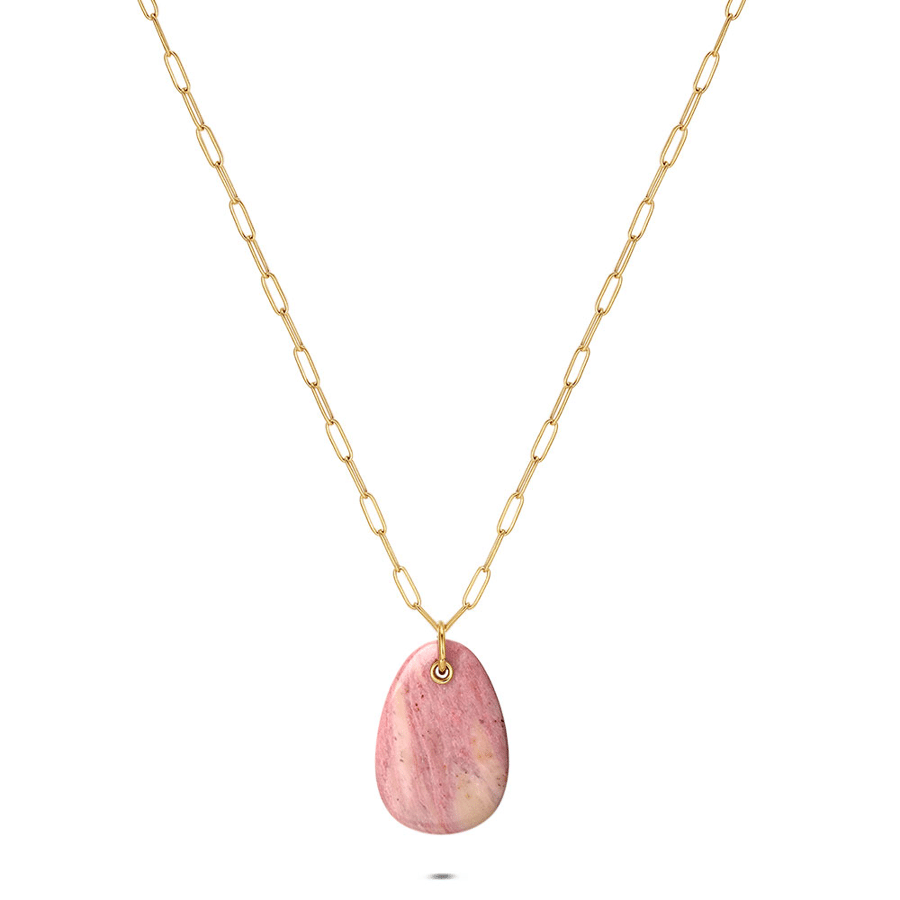 Stainless steel necklace, oval with a pink stone.