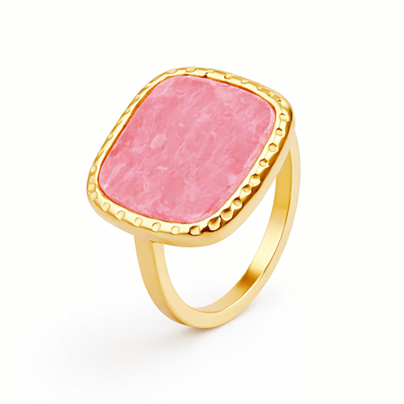 Bague en acier poli, grande pierre carrée rose.
