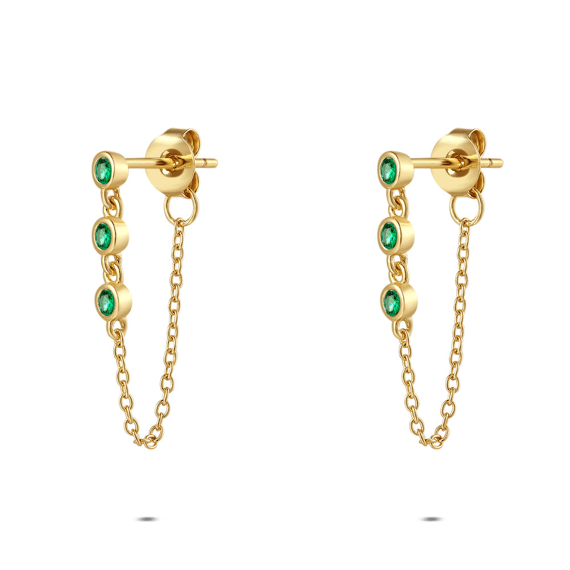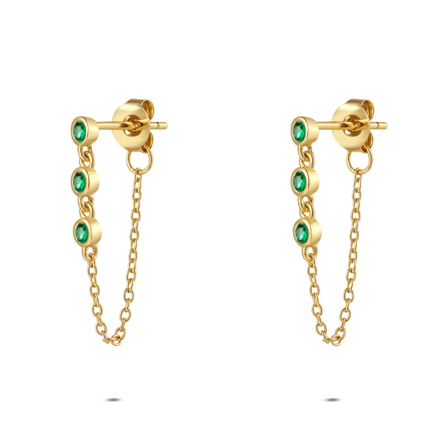 Boucles d’oreilles en argent, avec trois pierres vertes sur une chaîne.