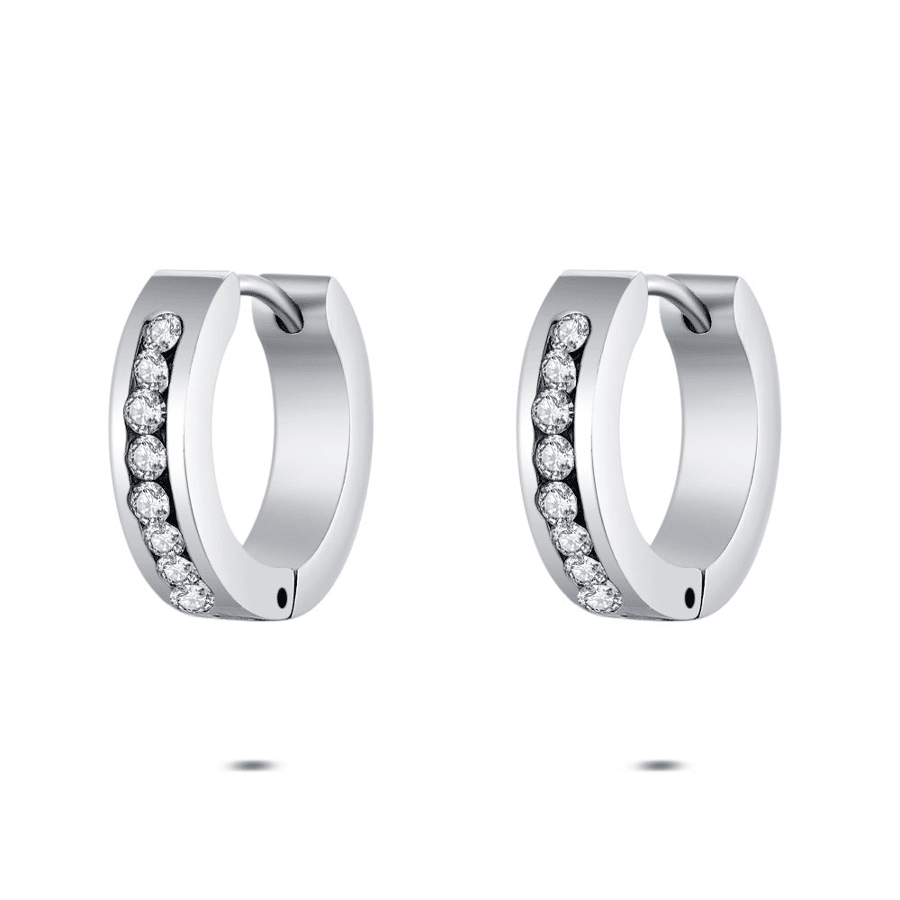 Boucles d’oreilles en acier poli, ornées d'une rangée de zircone à l'avant.
