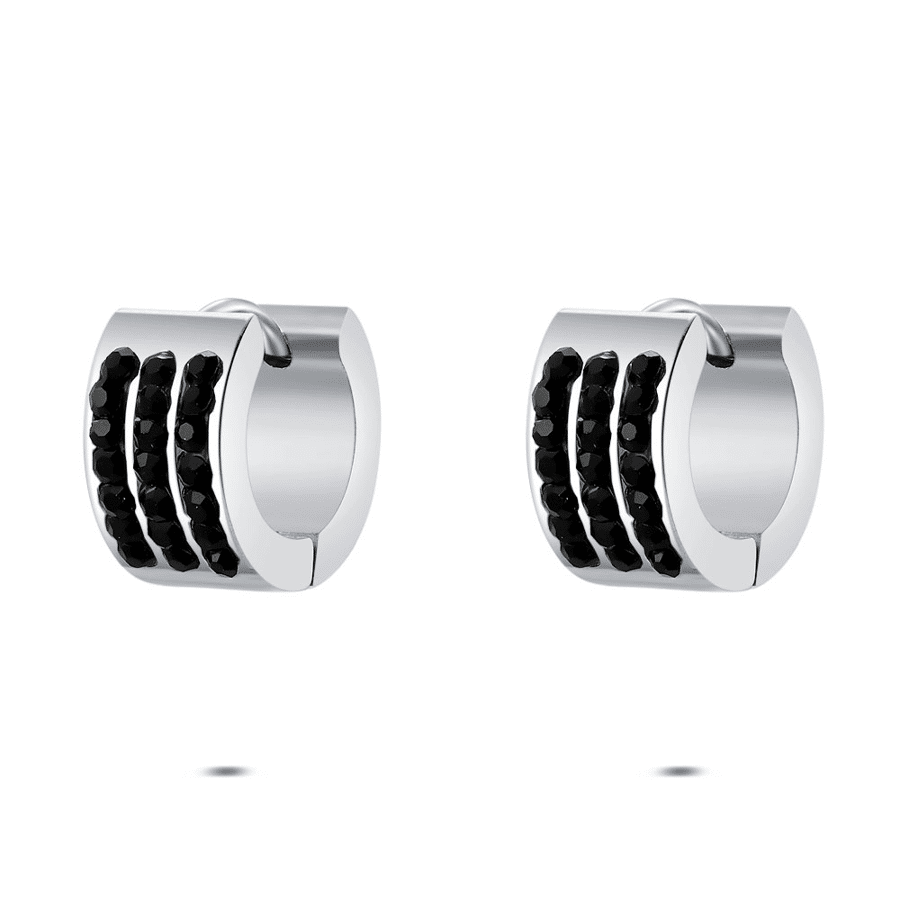 Boucles d’oreilles en acier poli, avec zircone noire en motif linéaire.