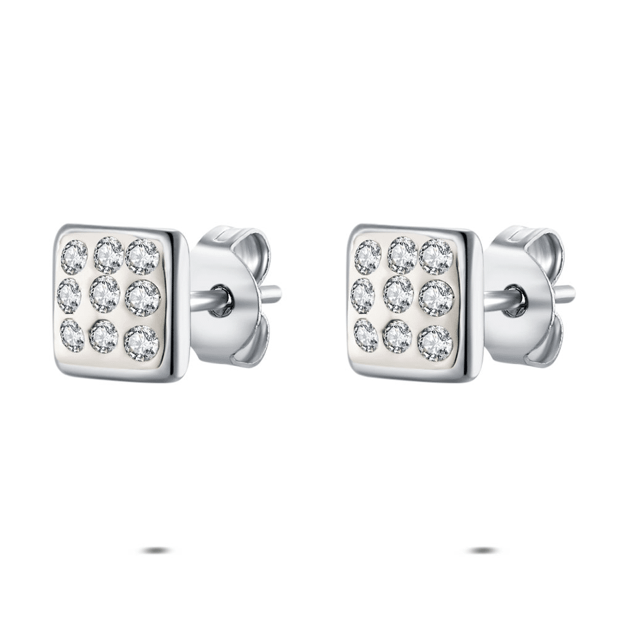 - Produit: Boucles d’oreilles en acier poli, carré avec zircone
