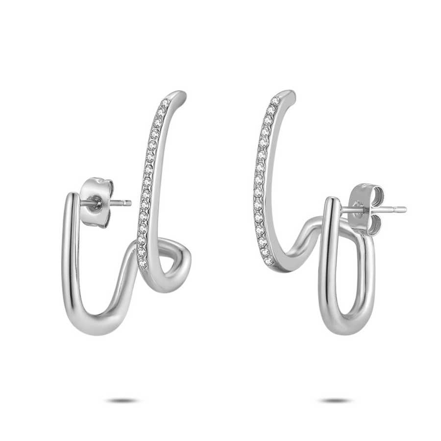 Boucles d’oreilles en acier poli couleur argent, avec une forme ondulée et une rangée de zircone.