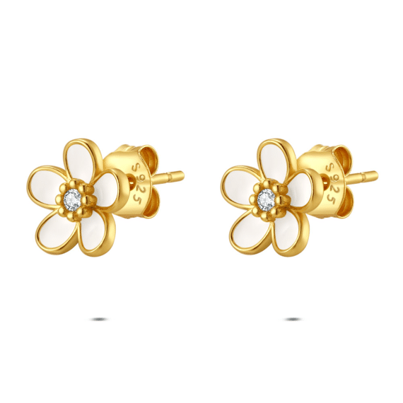Boucles d’oreilles en argent, forme de fleur avec une pierre blanche au centre.