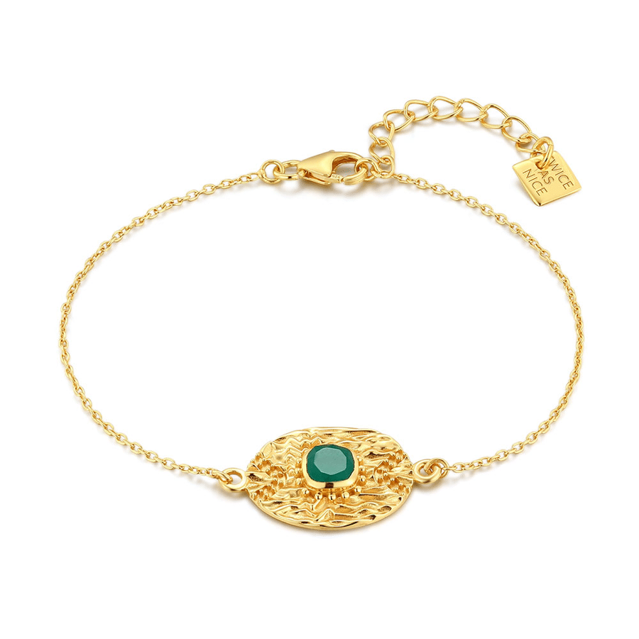 Bracelet en argent, avec une pierre verte dans un cadre gravé.