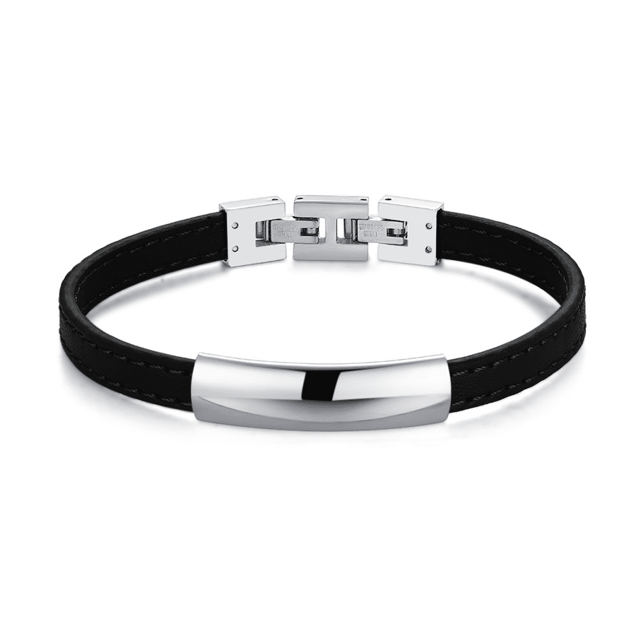- Produit: Bracelet en acier poli, bande en cuir noir
