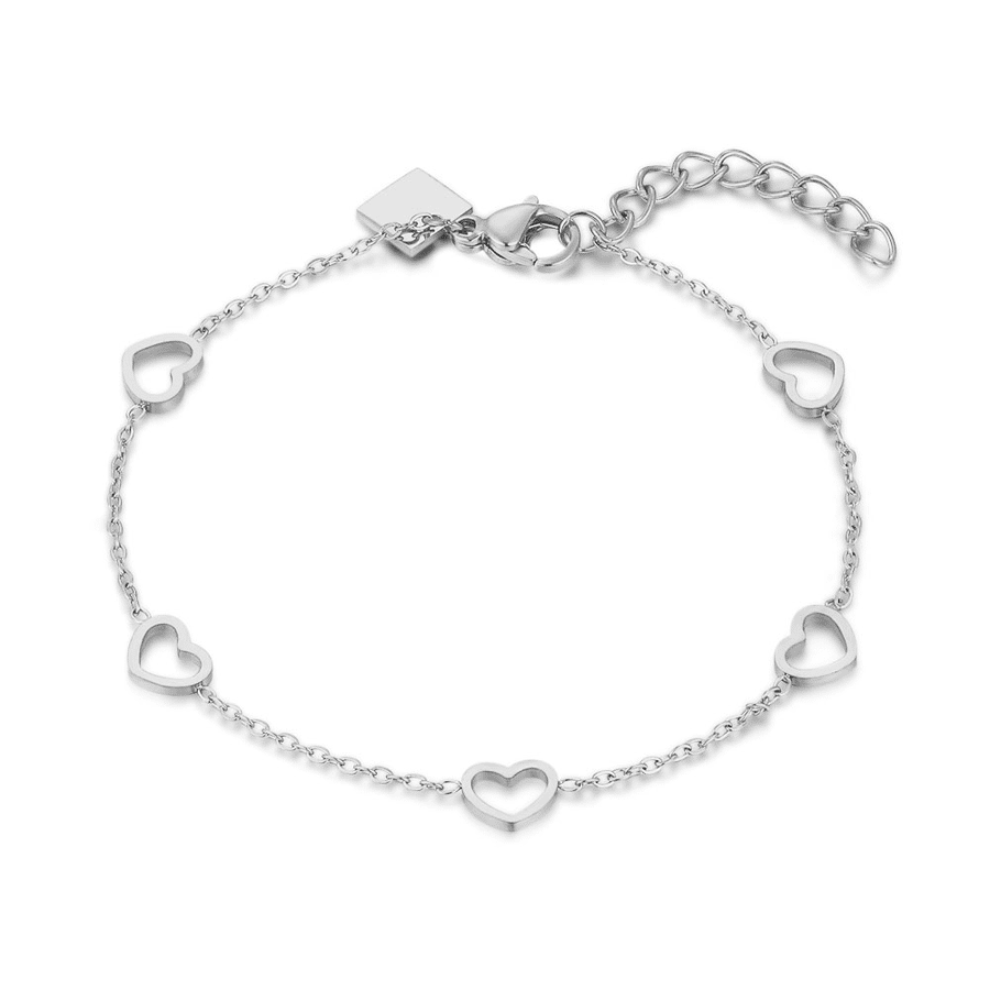 Bracelet en acier poli, 5 coeurs sur une chaîne.