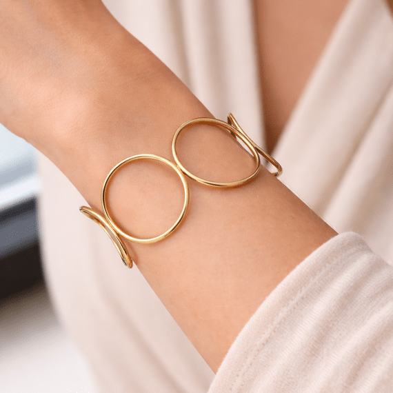 Bracelet en acier poli couleur or avec design ouvert et formes abstraites.