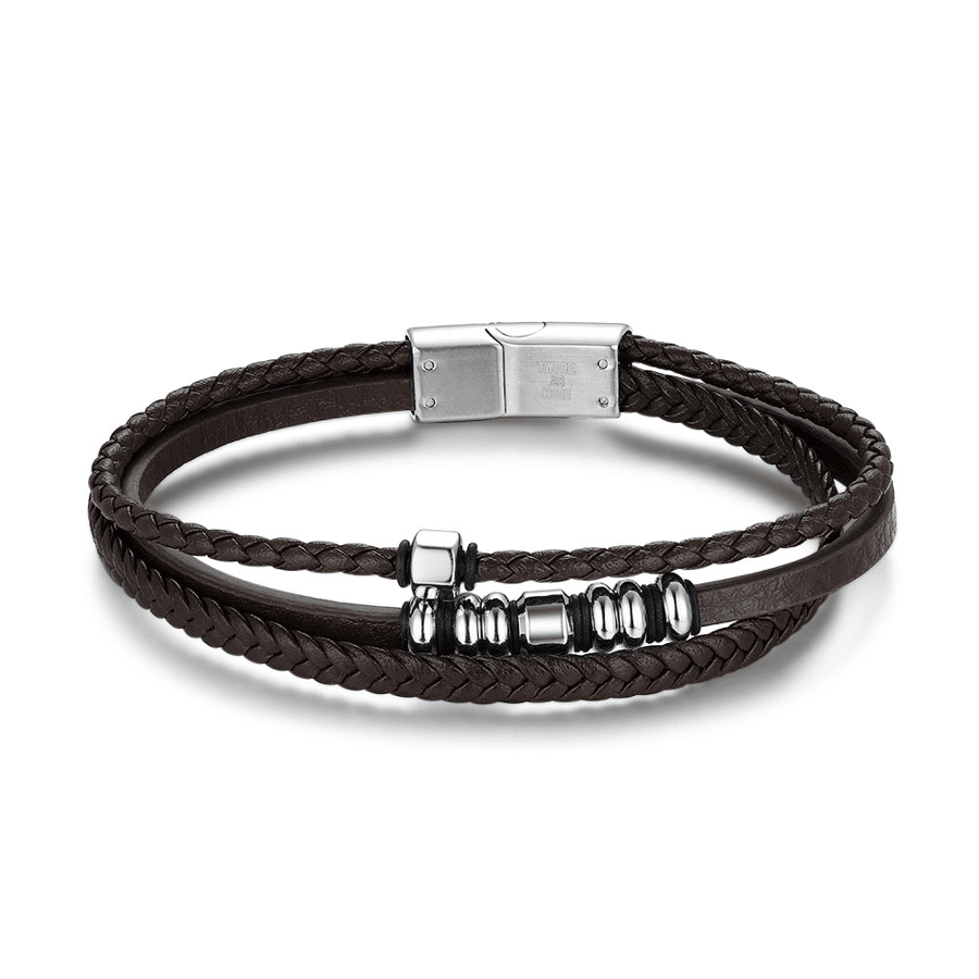 Bracelet en acier poli, tressé avec un fermoir et des éléments décoratifs.