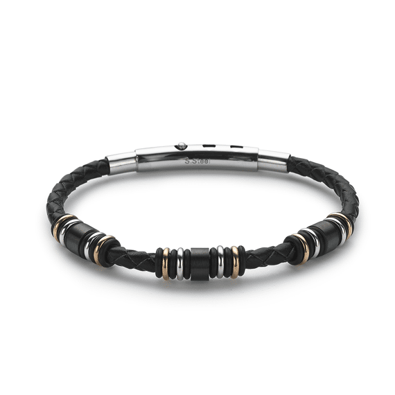 Bracelet pour homme en cuir noir.Petits anneaux que vous pouvez déplacer/séparer comme motifs décoratifs. Ajustable en 3 tailles.