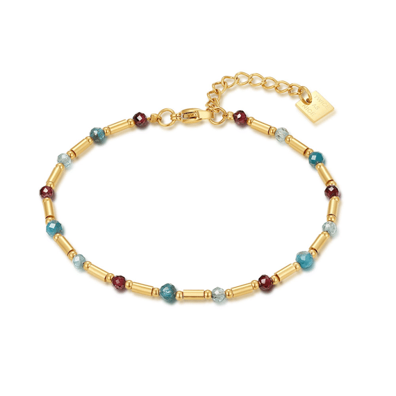 Bracelet en haute mode, avec des pierres colorées et des éléments métalliques.