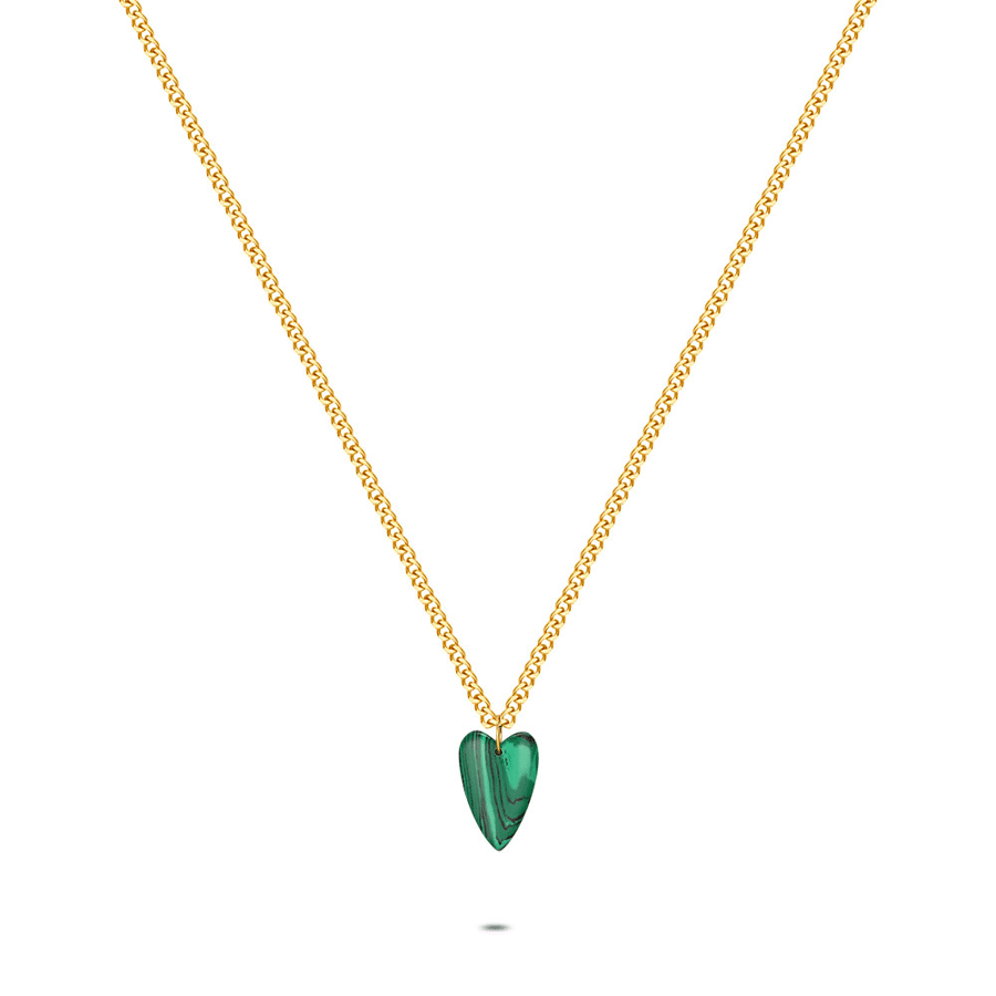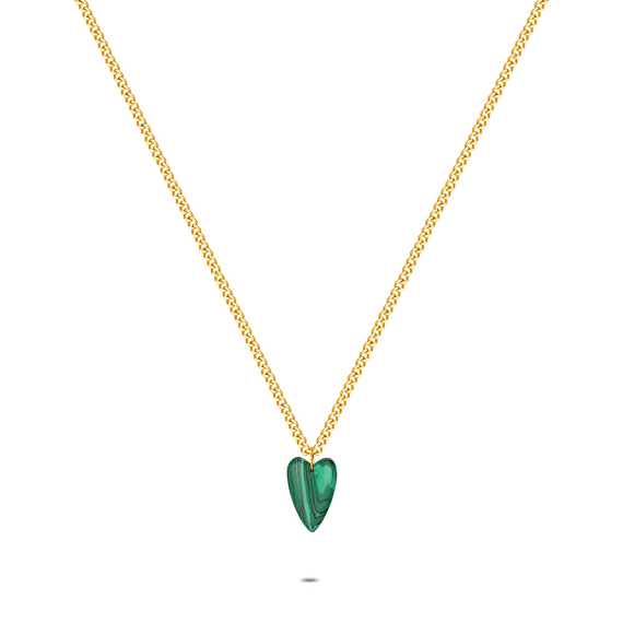 Collier en acier poli avec un coeur en malachite. Longueur de 45 cm avec une extension de 5 cm.