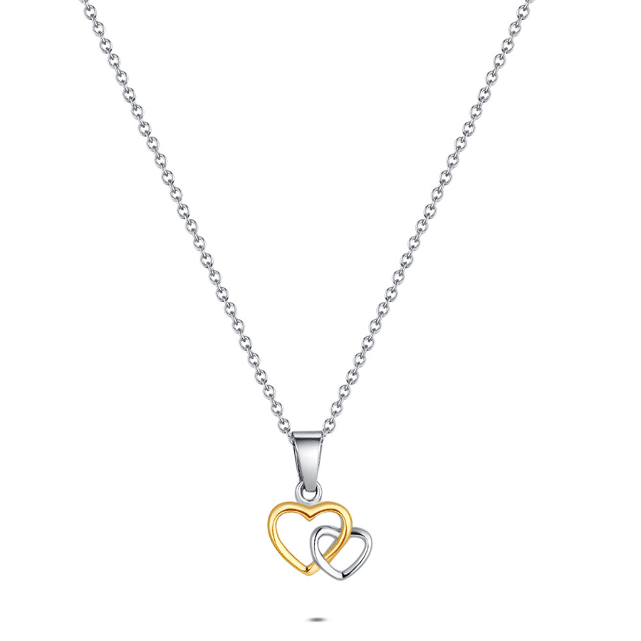 Collier en acier poli avec deux coeurs. Un des coeurs est plaqué or et l'autre est en acier.