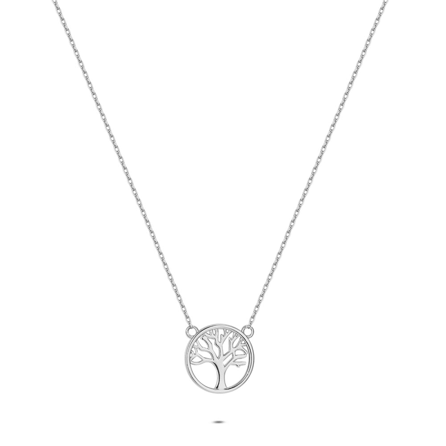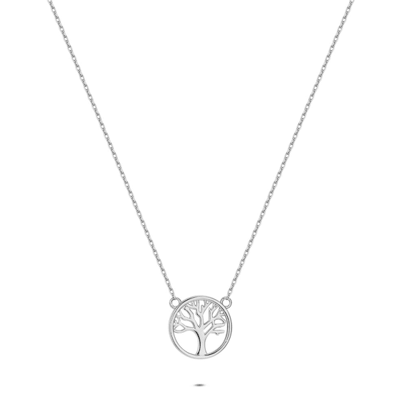 Collier en argent avec un pendentif rond et un design d'arbre.
