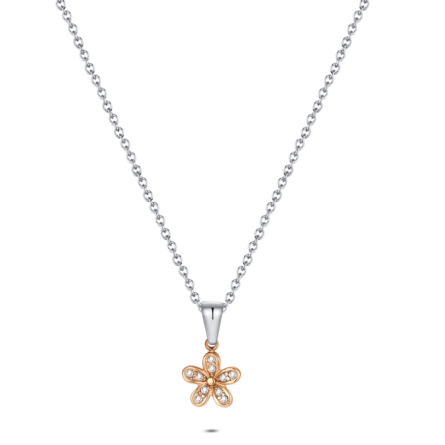 Collier en acier poli, pendentif en forme de fleur avec zircone. Idéal pour les occasions décontractées et festives.