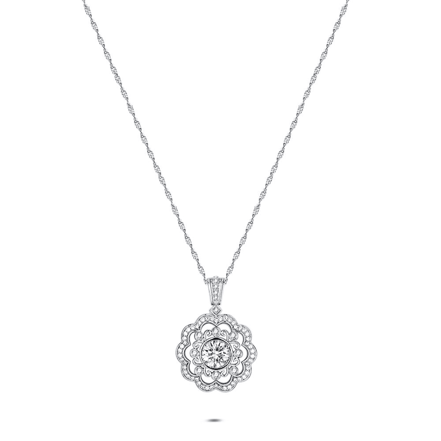 Collier en acier poli avec un pendentif en forme de fleur, orné de zircone.
