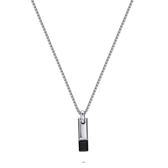 Collier en acier poli, pendentif de forme rectangulaire en noir et acier.