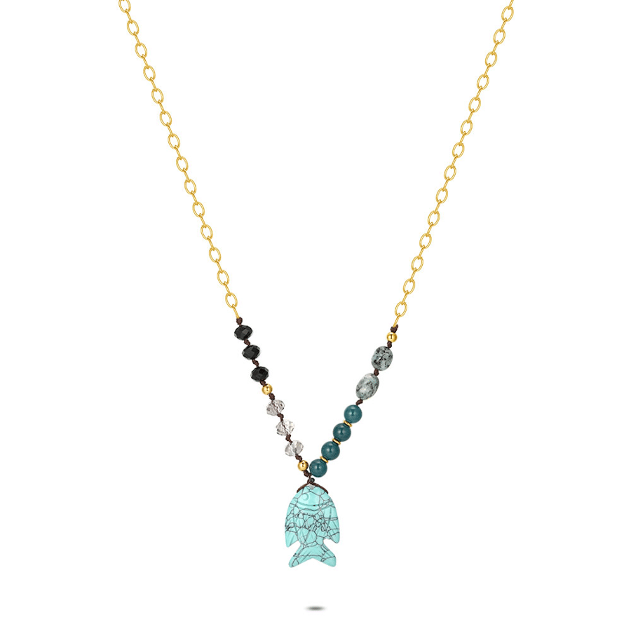 Collier en acier poli, poisson en pierre turquoise, avec différentes pierres vertes et noires.