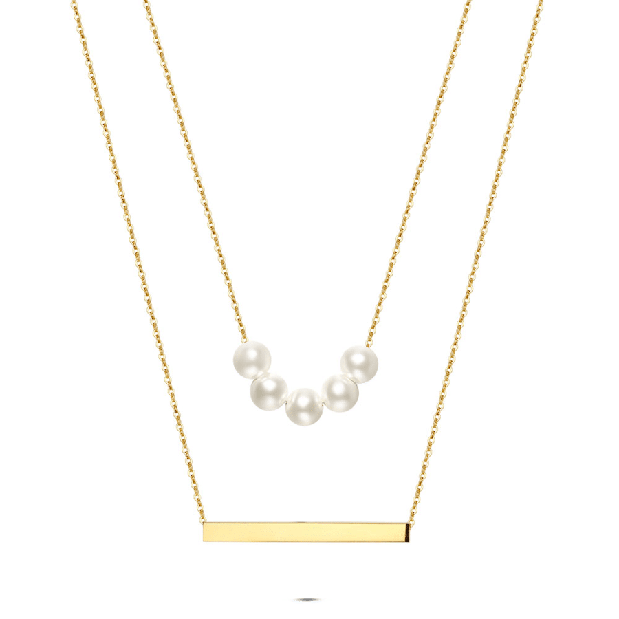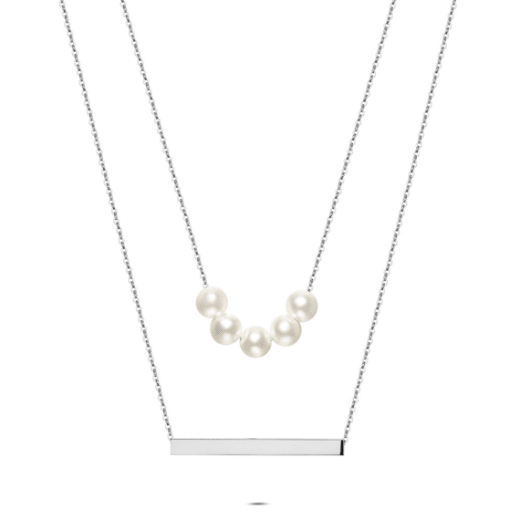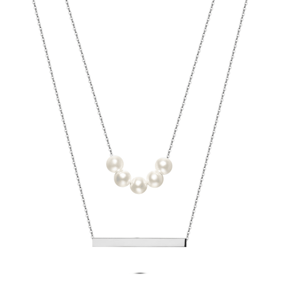 Collier en acier poli avec une rangée de perles et un élément rectangulaire.