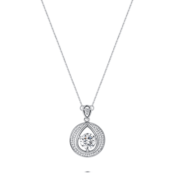 Collier en acier poli, en forme de goutte avec une grande zircone et des zircones plus petites autour.