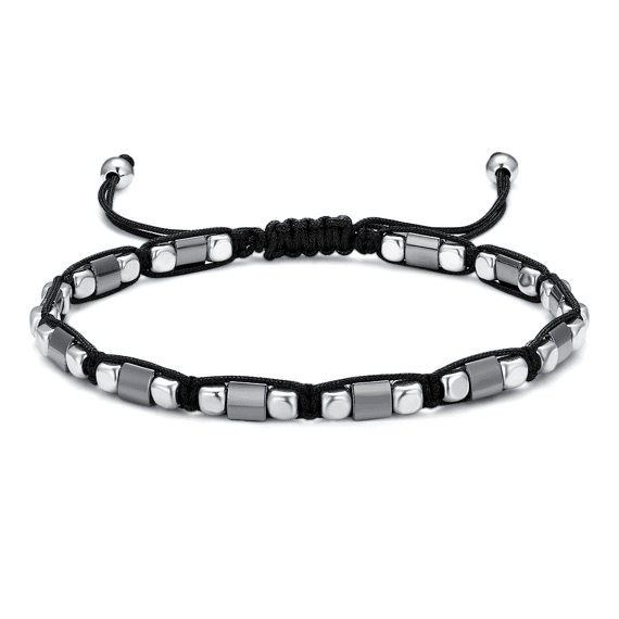 Armband in edelstaal, zwarte draad met metalen elementen.