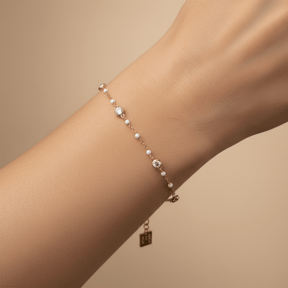 Armband in zilver, met witte kralen en zirkonia. Elegant ontwerp met een kettingstructuur.
