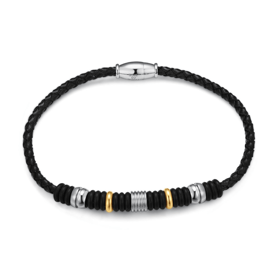 Armband in edelstaal, gevlochten ontwerp met zwarte en metalen onderdelen.