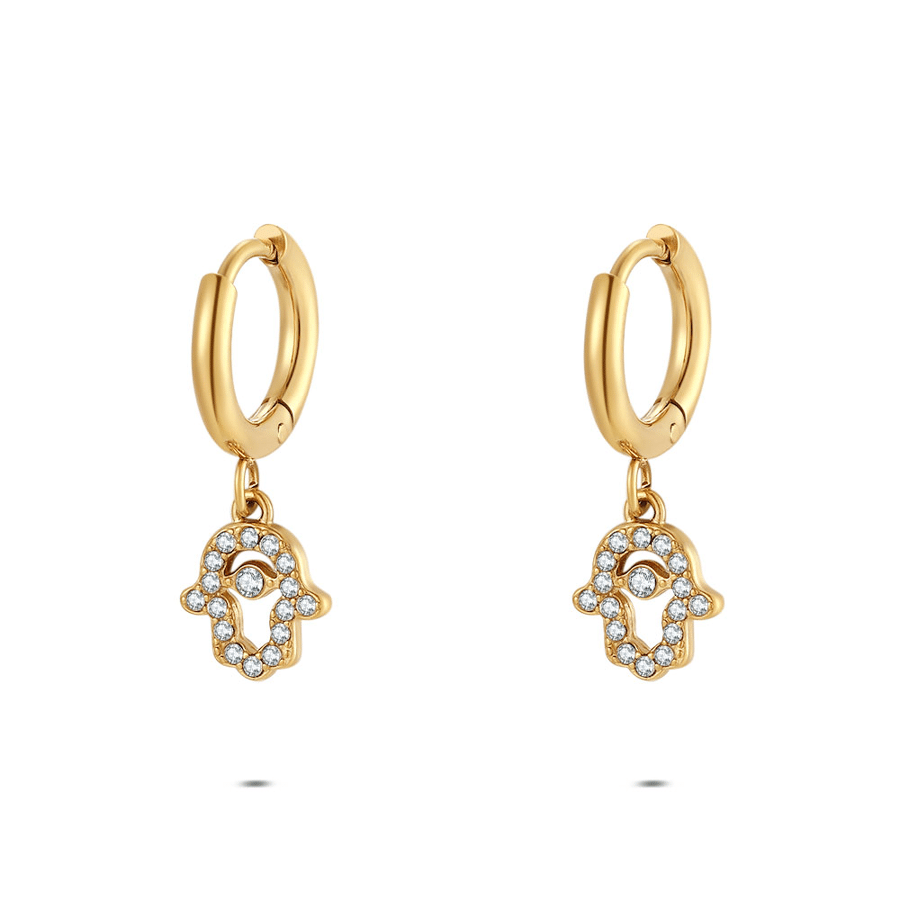 Oorbel in edelstaal, hangend handje met zirkonia.