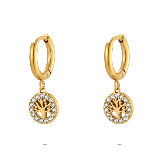 Oorbel in edelstaal, met een hangend boommotief en zirkonia.