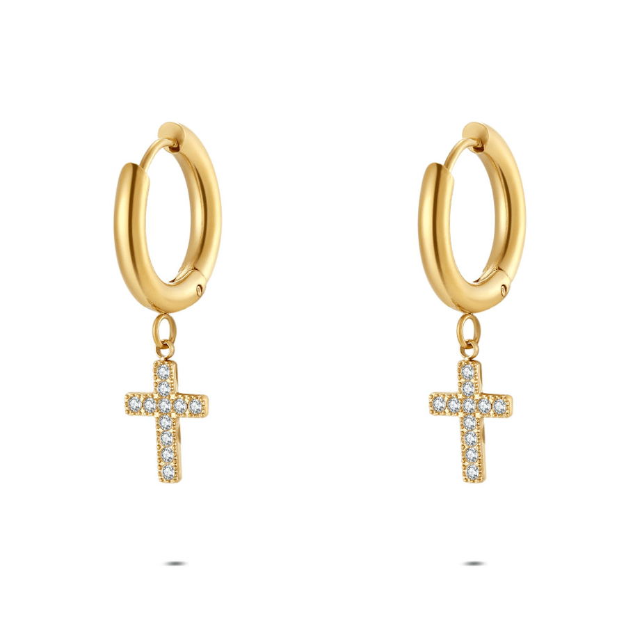 Oorbel in edelstaal met een hangend kruis en zirkonia.