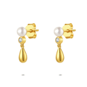 Oorbellen in 18kt verguld zilver, witte parels, heldere zirkonia en een hangende goudkleurige druppel.
