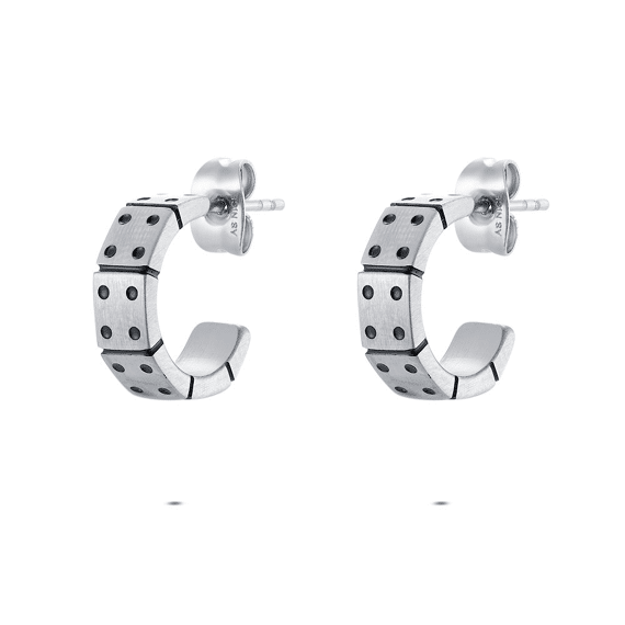 Oorbellen in edelstaal, met blokjespatroon en zwarte accenten.