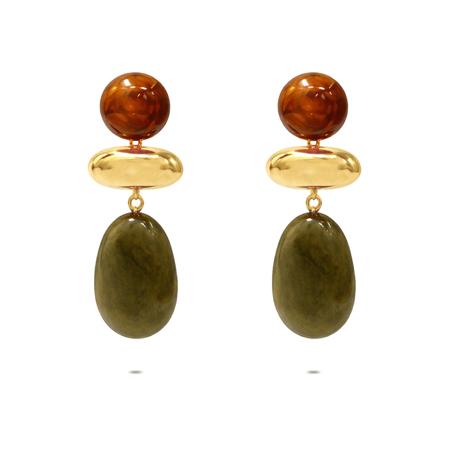 Oorbellen in edelstaal, bovenste bol in bruin en onderste druppel in groen. .